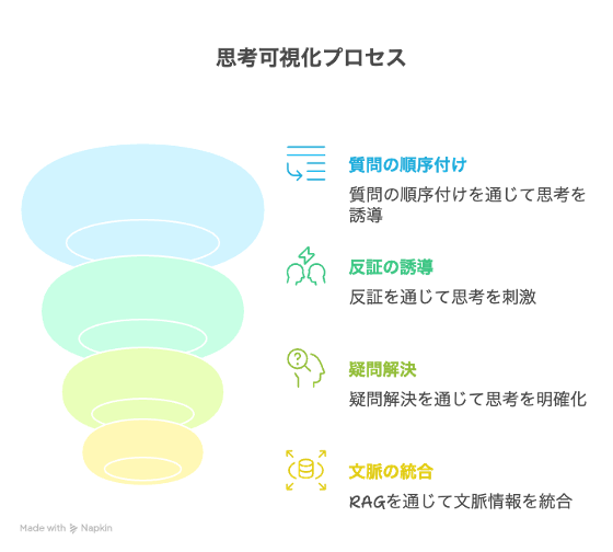 - 想定応用:ニーズ発掘,学習者のリフレクション支援,研究計画レビュー,組織の意思決定会議のファシリテーション.